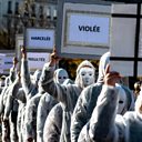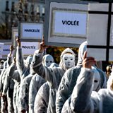 (Photo: Protestors dressed in white carry placards as they take part in a demonstration in Lyon marking the International Day for the Elimination of violence against Women 2018. Credit: JEFF PACHOUD/AFP/Getty Images)