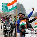 (Photo: People ride motorbikes before the arrival of Indian Air Force pilot, near Wagah border. Credit: Danish Siddiqui/Reuters)