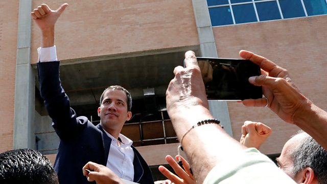 Venezuela's self-declared interim leader Juan Guaidó has arrived in Caracas, where he risks arrest. He defied a travel ban when he crossed into Colombia two weeks ago. We go live to Caracas where Mr Guaido addresses massive crowds of supporters.