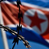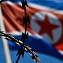 (Image: The North Korean flag with barbed wire in its foreground in a photo from 22nd March 2017. Credit: Chris Jung/NurPhoto/Getty Images)