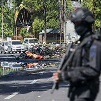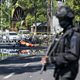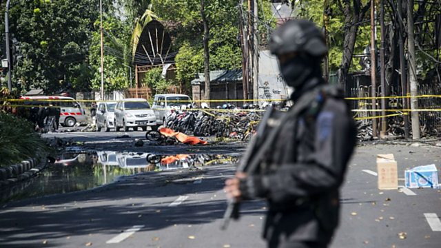 (Image: An Indonesian anti-terror policeman stands guard at the blast site following a suicide bomb outside a church in Surabaya on 13th May 2018. Credit: Juni Kriswanto/AFP/Getty Images)