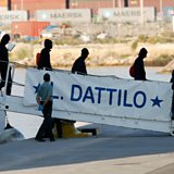 (Picture: Migrants leave the Italian ship Datillo at the port of Valencia. Credit: Carlos Cardenas/EPA)