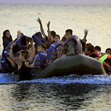 (Image: Jubilant Afghan migrants on board an overcrowded dinghy. Credit: Reuters)
