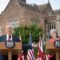 (Picture: Donald Trump and Theresa May talk to the press at Chequers. Credit: Stefan Roussea/Getty)