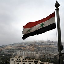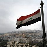 Image: the Syrian national flag amidst war-damaged buildings. Credit: AFP.