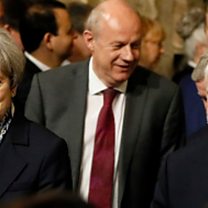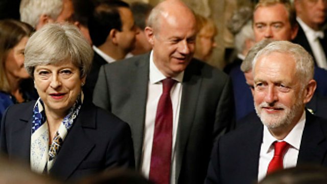 (Image: Britain's Prime Minister Theresa May, centre, and leader of the opposition Jeremy Corbyn, right, walk through the House of Commons to attend the state opening of Parliament at the Palace of Westminster on June 21, 2017 in London, England. Credit: Kirsty Wigglesworth/WPA Pool/Getty Images)