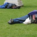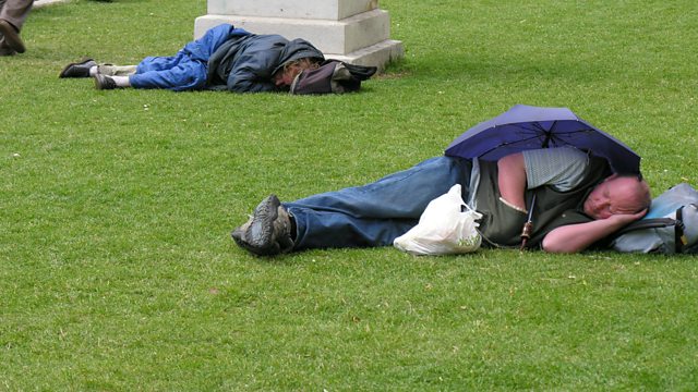 (Image: Two men sleeping rough in a park in the UK. Credit: BBC)