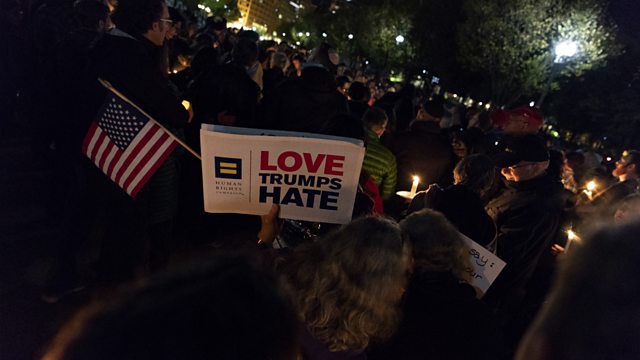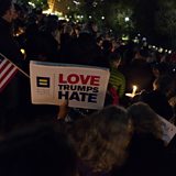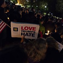(Image: A vigil participant holds a "Love Trumps Hate" sign in front of the White House. Credit: Getty Images)