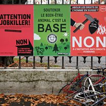 (Picture: campaign posters in Switzerland, which will today vote in a referendum on three issues. Credit: AFP)