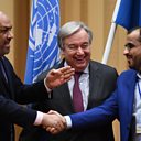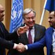 (Picture: Yemen's foreign minister Khaled al-Yamani (L) and rebel negotiator Mohammed Abdelsalam (R) shake hands under the eyes of United Nations Secretary General Antonio Guterres during peace consultations taking place in Sweden Credit: Nackstrand / AFP)