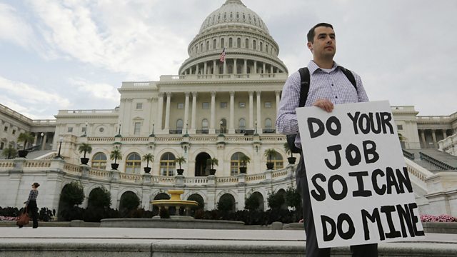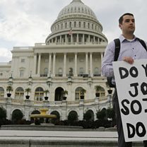 (Photo: A furloughed federal employee holds a sign on the steps to the US Capitol after the government shutdown. Credit: REUTERS/Larry Downing)