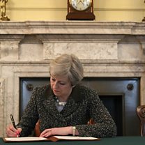(Photo: British Prime Minister signing the BREXIT - ARTICLE 50: With Union Jack flag in the background; Credit: Christopher Furlong - WPA Pool/Getty Images)