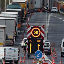 (Image: Trucks queue on the Dunkirk-Calais motorway as French Customs Officers increase their controls. Credit: Reuters)