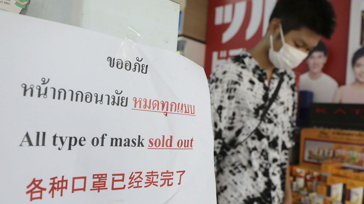 (Photo: A masked man walks past a sign saying "All type of mask soldĀ out" at a pharmacy in Siam square, Bangkok. Credit: Getty Images.)