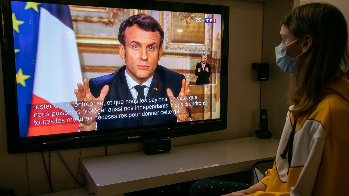 (Image: A young woman watches a televised address by French President Emmanuel Macron announcing measures to tackle coronavirus.Photo by Marc Piasecki/ Getty Images)