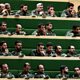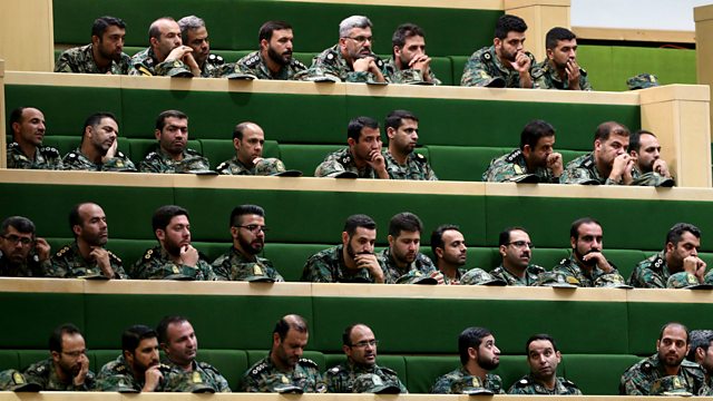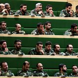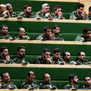 Image: Members of the Iranian Revolutionary Guard listen to a speech in parliament in Tehran. Credit: Atta Kenare/AFP/Getty Images.