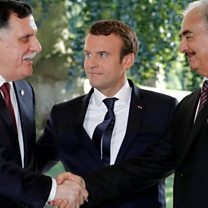 (President Emmanuel Macron (C) has tried to mediate between Prime Minister Sarraj (L) and Gen Haftar (R). Credit: Reuters)