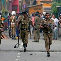 (Photo: Sri Lankan police near the site of an exploded van at a church that was attacked yesterday in Colombo. Credit: Reuters)
