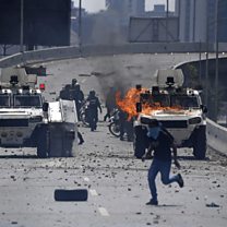 (Photo: Supporters of Venezuelan opposition leader and self-proclaimed acting president Juan Guaido clash with forces loyal to President Nicolas Maduro in Caracas, 30 April 2019. Credit: Federico Parra/AFP/Getty Images)