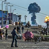 Picture: Palestinians gather on the beach in Gaza City as smoke and fire billow following airstrikes by Israel in response to rockets fired by Palestinian militants on May 4, 2019. Credit: SAMI AL-SULTAN/AFP/Getty Images