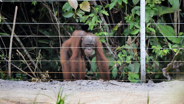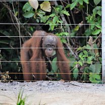 (Image: an orangutan looking at the electric fence outside the city of Ketapang in West Kalimantan. Credit: Bay Ismoyo/AFP/Getty Images).