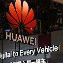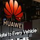 (Photo: Signs displayed at the Huawei stand at the Shanghai Auto Show in Shanghai. Credit: AFP/Getty Images)
