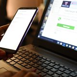 (Image: A woman uses a smartphone in front of a laptop. Credit: Issouf Sanogo/AFP/Getty Images)