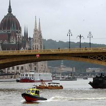 (Photo: Police and rescue boats are seen on Budapest's Danube river near the zone where the 'Mermaid' sightseeing boat sank after colliding with a larger vessel. Credit: Ferenc Isza/AFP/Getty )