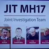 (Picture: Fred Westerbeke of the Joint Investigation Team in front of a picture of the suspects: Igor Girkin, Oleg Pulatov, Sergey Dubinskiy, Leonid Kharchenko. Credit: EPA/ROBIN VAN LONKHUIJSEN)