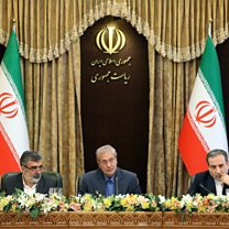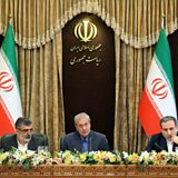 (Picture: (L to R) Iran's Atomic Energy Organisation spokesman Behrouz Kamalvandi, government spokesman Ali Rabiei, and Deputy Foreign Minister Abbas Araghchi give a joint press conference at the presidential headquarters in the capital Tehran. Credit: should read Hamed Malekpour/AFP/Getty Images)