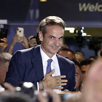 (Photo: Greek opposition New Democracy conservative party leader Kyriakos Mitsotakis waves to his supporters. Credit: Milos Bicanski/Getty Images)