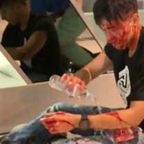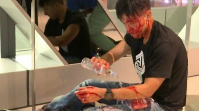 PHOTO: A man beaten by men in white t-shirts in Hong Kong. CREDIT: AFP
