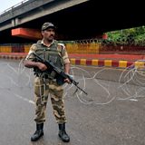 (Photo: Army personnel stand guard during restrictions on August 5, 2019 in Jammu. Credit: Nitin Kanotra/Hindustan Times via Getty Images)