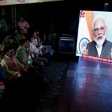 (Photo: People in Bhopal, India watch prime minister Narendra Modi during a live TV address on the disputed Kashmir region. Credit: EPA/Sanjeev Gupta)