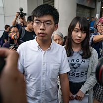 (Photo: Hong Kong pro-democracy activists Agnes Chow and Joshua Wong leaving court after being released on bail; Credit: Getty Images)