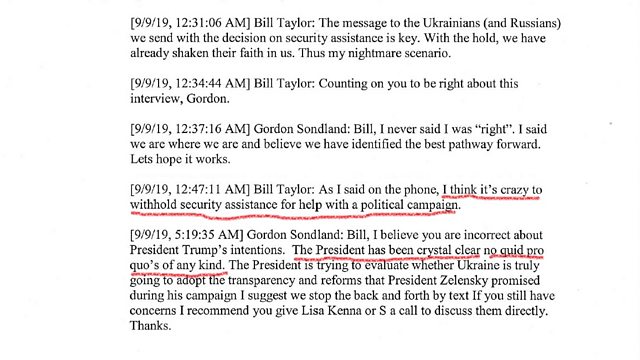 (Picture: Text message exchange between US officials Bill Taylor and Gordon Sondland. Credit: BBC)