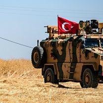 (Picture: A US soldier walks next to a Turkish military vehicle during a joint patrol with Turkey in the Syrian village of al-Hashisha. Credit: Delil Souleiman/AFP/Getty Images)