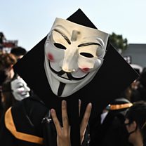 Picture: University students wear Guy Fawkes masks during an anti-government protest at the Chinese University of Hong. Credit: Philip Fong/AFP via Getty Images.