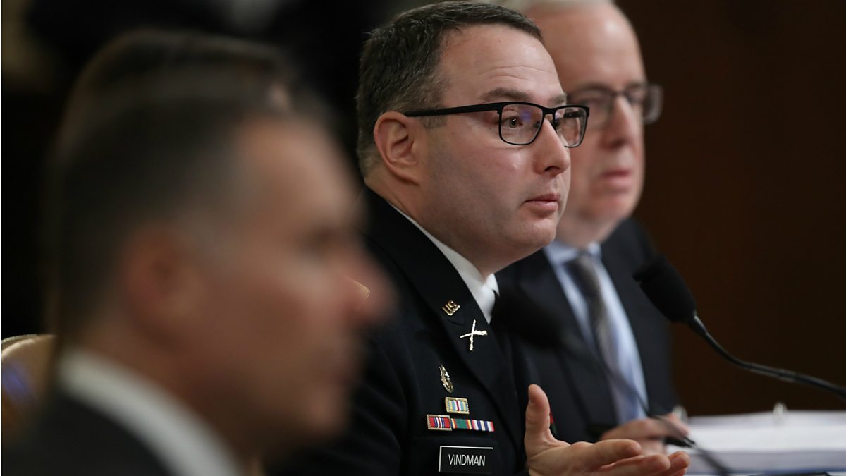 Two White House aides who listened in on Trump-Ukraine call that sparked impeachment inquiry are testifying. One of them, Lt Col Vindman, says Trump’s request to Ukraine to look into Joe Biden was 'improper'.