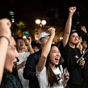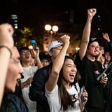 (Picture: Pro-democracy supporters celebrate after pro-Beijing candidate Junius Ho lost his seat. Credit: Getty Images)