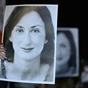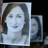 Picture: Protesters hold pictures of Daphne Caruana Galizia as they gather outside the Prime Minister’s office in Valletta, Malta. Credit: Matthew Mirabelli/AFP
