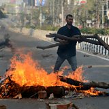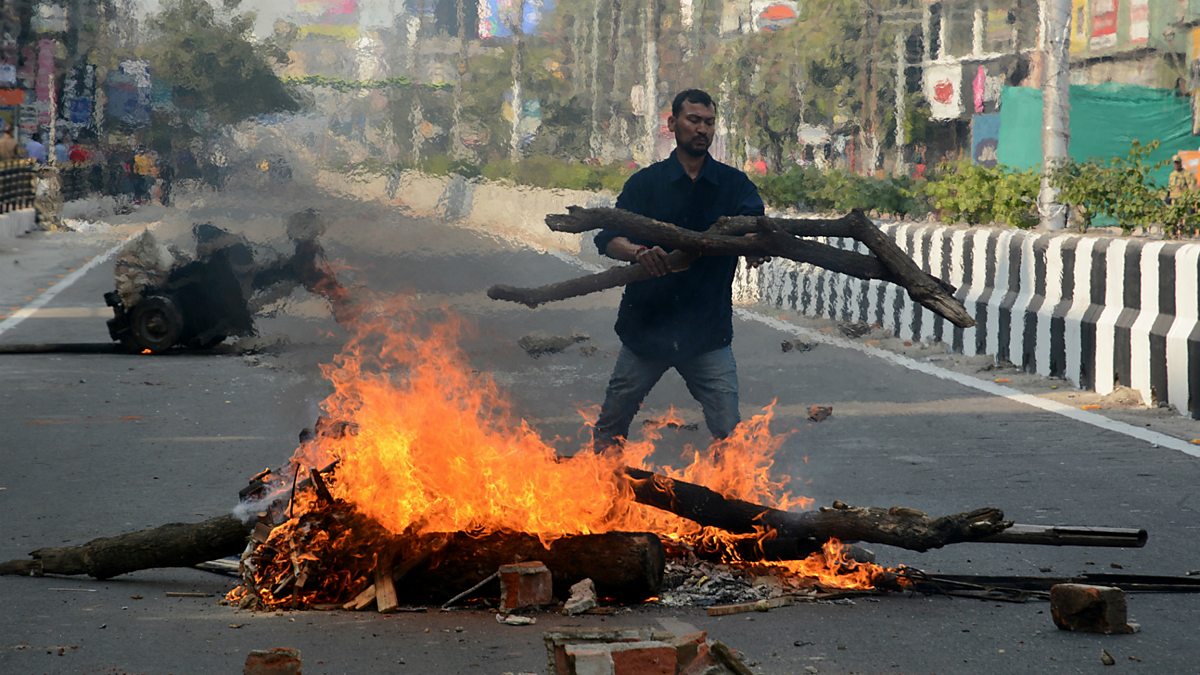 (Photo: A person burns wood during anti-Citizenship Amendment Bill protests in Guwahati, Assam. Credit: EPA)