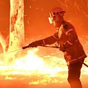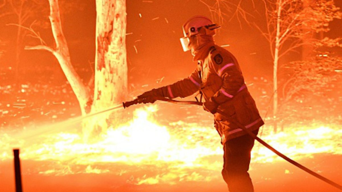 (A firefighter hoses down trees and flying embers in an effort to secure nearby houses from bushfires near the town of Nowra in the Australian state of New South Wales. Photo by SAEED KHAN/AFP via Getty Images)
