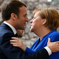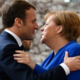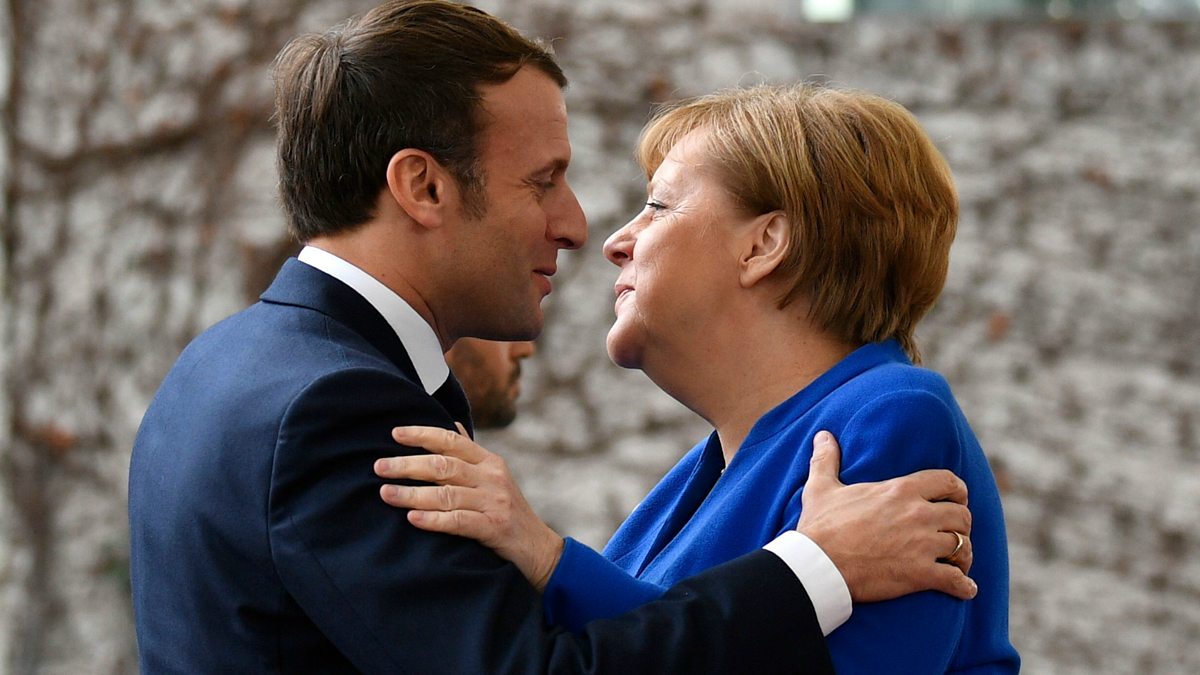 (Photo: German Chancellor Angela Merkel greets French President Emmanuel Macron in Berlin. Credit John MacDougall/AFP)