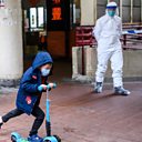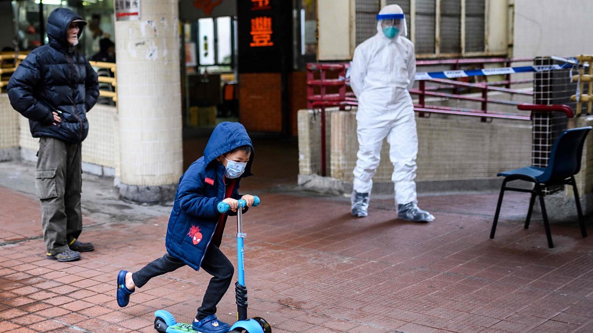 (Picture: A child wearing a face mask rides his scooter past a police officer wearing protective gear at Cheung Hong Estate in Hong Kong on February 11, 2020. Credit: AFP/Getty Images),
