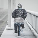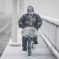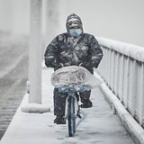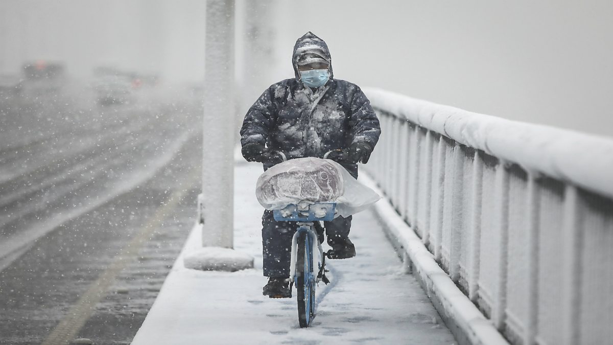 (Photo: A man wears a protective mask as he rides a bike over the Yangzi river bridge as snow falls on February 15, 2020 in Wuhan, Hubei, China. Credit: Getty Images)
