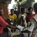 (Photo: Visitors to a state hospital collect face masks, hand gloves and have their hands sanitised as they walk past the security post entrance in Lagos. Credit: Getty Images)