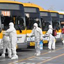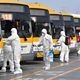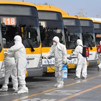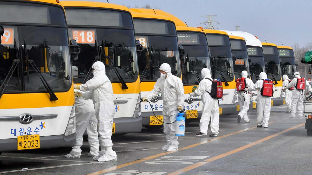 Picture: South Korean government officials wearing protective gear spray disinfectant as part of preventive measures against the spread of the COVID-19 coronavirus, at a bus garage in Gwangju on March 3, 2020. Credit: AFP via Getty Images.