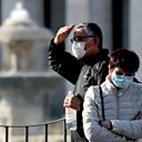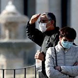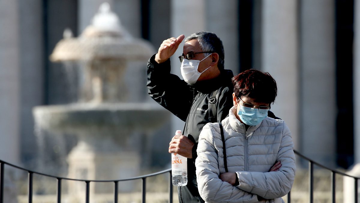 (Picture: Tourists wear protective face masks as they arrive at an empty and closed St. Peter's Square. Credit: Franco Origlia/Getty Images)