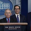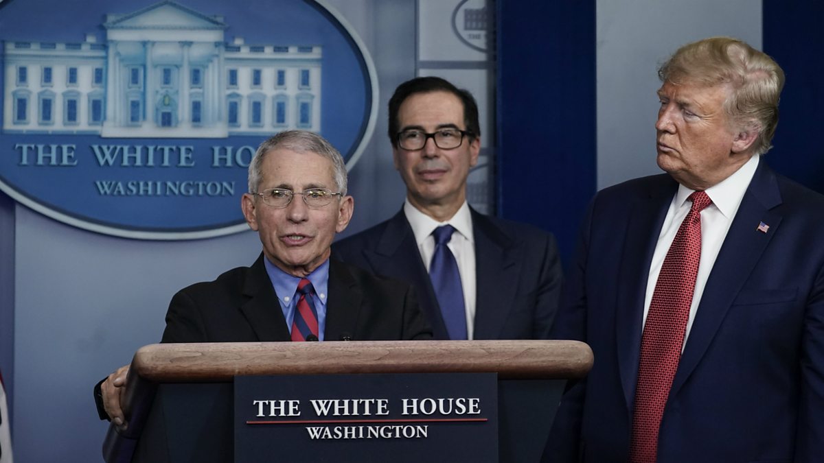 (Picture: National Institute of Allergy and Infectious Diseases Director Anthony Fauci speaks as U.S. President Donald Trump and Treasury Secretary Steven Mnuchin look on during a briefing on the coronavirus pandemic. Credit: Drew Angerer/Getty Images)